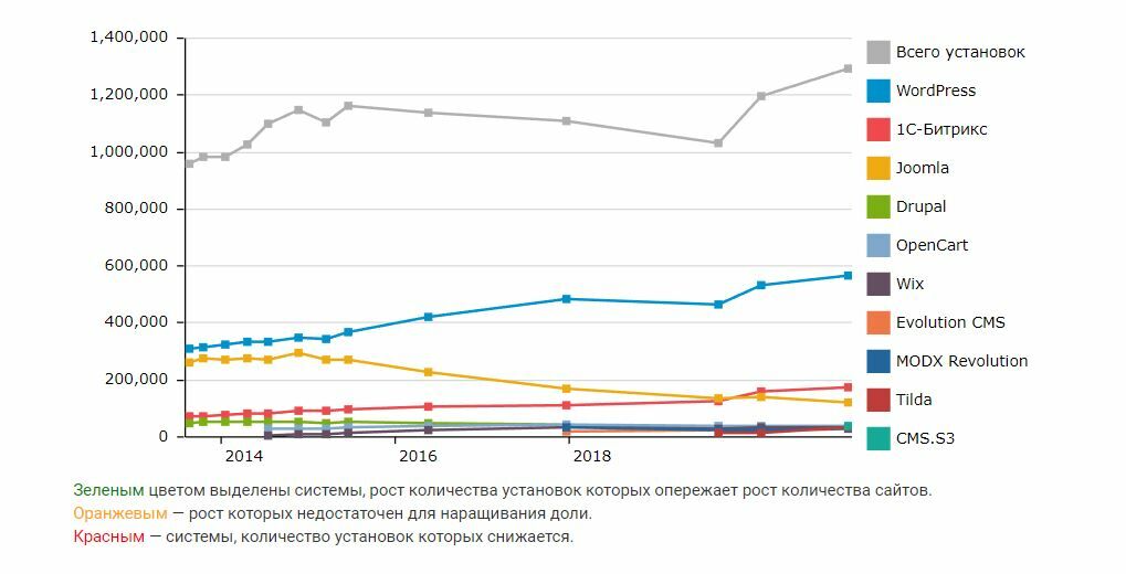 Количество установок популярных CMS